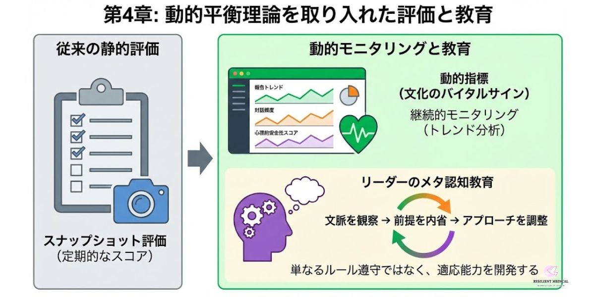 従来の安全文化評価は、年に一度のアンケート調査など、ある時点での状態を切り取る「静的なスナップショット」にとどまることが多かった。しかし、動的平衡の視点に立てば、文化は常に変動している。 今後は、時間の経過とともに変動する「文化の動的指標(バイタルサイン)」を導入し、継続的にモニタリングする必要がある。