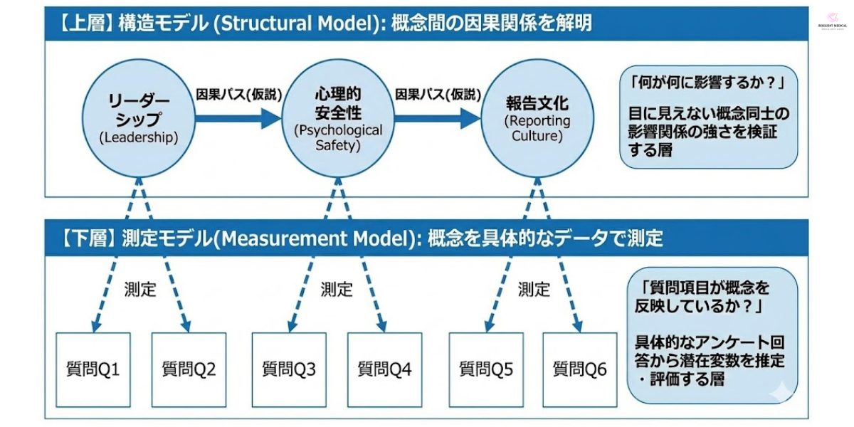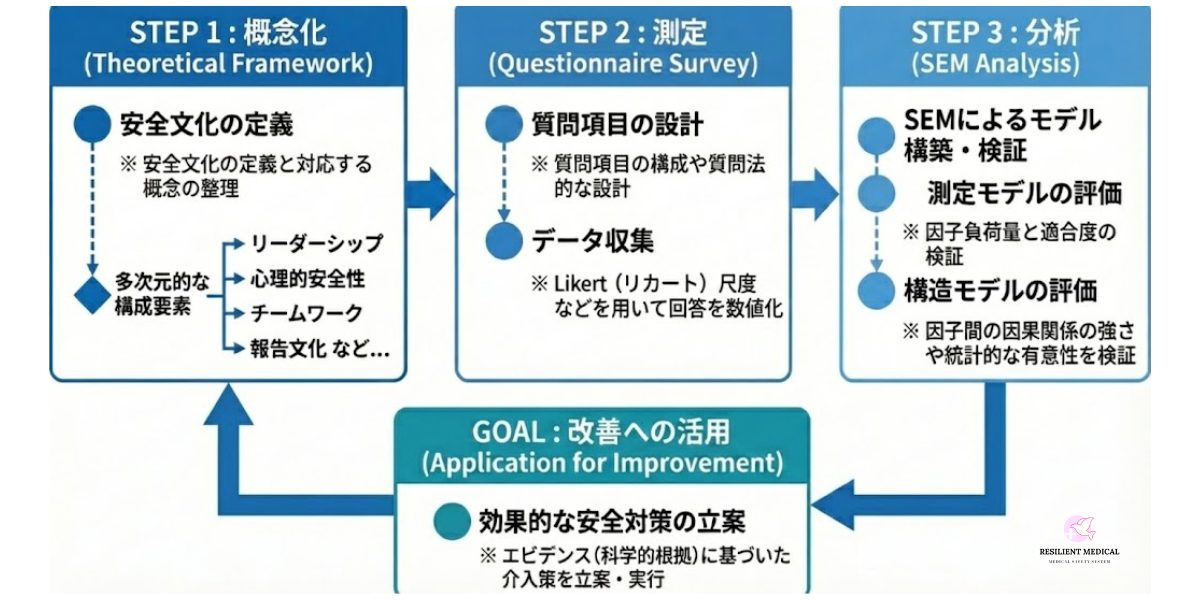 構造方程式モデリングとは、観測変数と潜在変数の関係性を統計的にモデル化し、因果構造を検証する手法である。特に安全文化のように抽象的かつ多因子的な構成をもつ概念の分析に有効である。